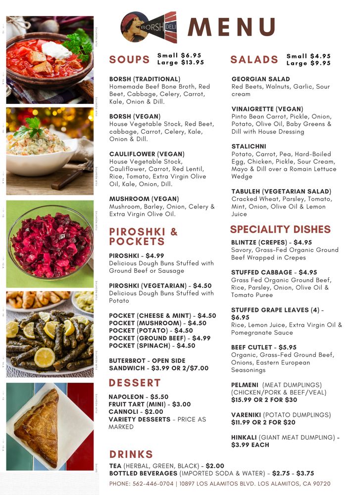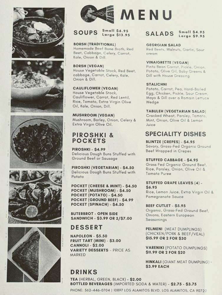 Introducing Borsh Deli, a hidden gem nestled in Los Alamitos, CA, where authentic Russian flavors come to life. This charming deli is more than just a place to grab a bite; it's an experience that evokes nostalgia for family gatherings and homemade meals. The menu is a delightful array of traditional dishes, featuring standout items like rich borscht topped with fresh dill and sour cream and the beloved shuba salad, layered to perfection.